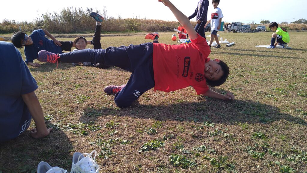 みんなでゴールを作って何となくのサイズ感でゴールを置き、ラインは引かずにラインアウトは特に気にせず自由にゲーム。
