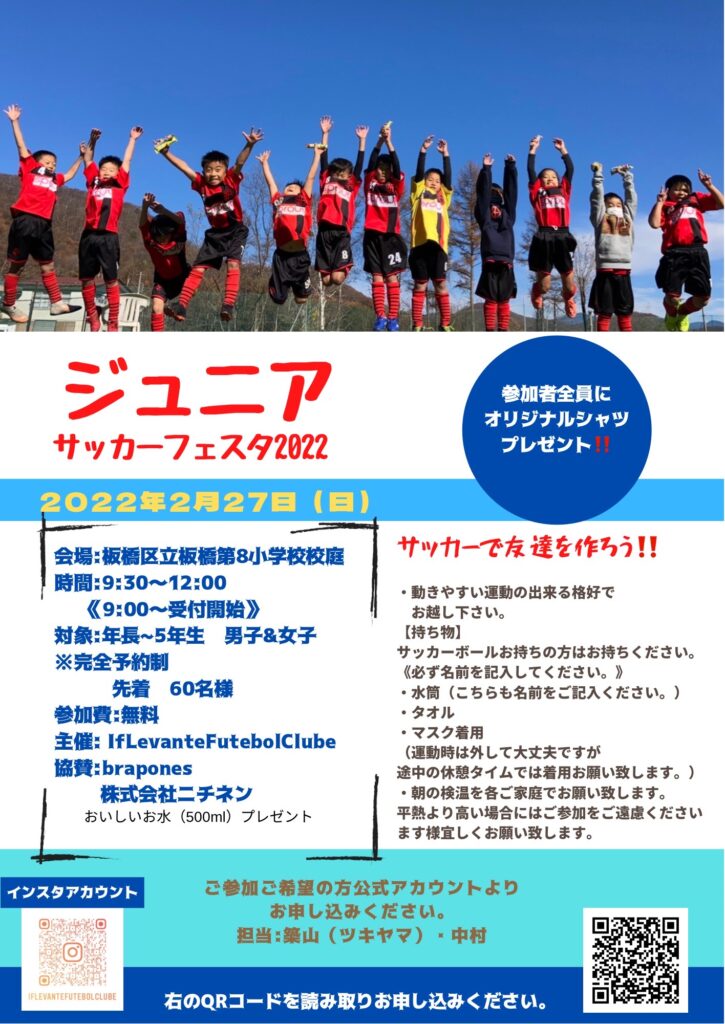 ジュニアサッカーフェスタ板橋エントリー状況 2022.02.15 https://iflevante.jp/report/event/3749/ 2月27日に開催のジュニアサッカーフェスタ板橋 現在はまだエントリーが可能です。 参加者全員にプレゼントをご用意させて頂きます。 エントリーは公式LINEにてお願い致します。 60人までまだ多少余裕があります。 お友達と一緒に遊びに来てください。 どうぞ宜しくお願い致します。
