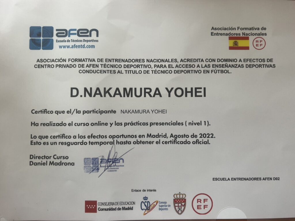 スペインサッカー協会ライセンスレベル1を取得することが出来ました。