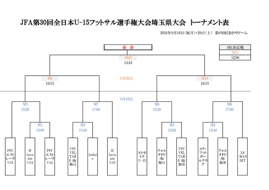 【予定】JFA第30回全日本U-15フットサル選手権埼玉県大会 2024.09.25 中学生年代の全日本フットサル選手権 9月28日に埼玉県チャンピオンが決まります。 準決勝 FFCエストレーラvsIf Levante Sol L S/BANDITvs VFC 決勝はどちらも勝者です。 会場は熊谷ドーム体育館となります。 これはもう駆けつけないと!! If Levanteが優勝する瞬間に立ち会ってください。 精一杯に選手たちが戦い抜きます。 9月28日は熊谷ドーム体育館で予定してください。 皆様のお越しお待ちしています。