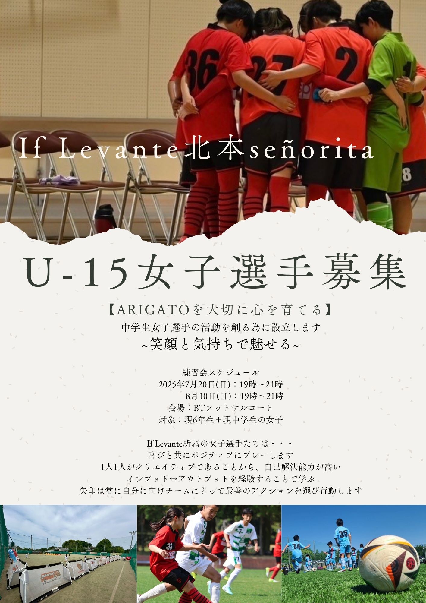 【U-15女子】練習会スケジュール 2025.07.10 https://iflevante.jp/report/u15/8219/ 女子U-15練習会を開催します If Levanteトレーニングセンターと合同になります エントリーは所属チームの指導者 もしくは 個別でメールorメッセージ、DMください お待ちしております