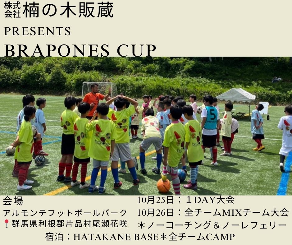 【予定】㍿楠の木販蔵presents BRAPONES CUP 2025.10.25 毎年夏開催のこの大会今年は秋になりこの時期に開催 ノーコーチングやノーレフェリー全チームのシャッフルチームを結成して大会を楽しむ そんな大会です【心を育てる】そんな大会 1人1人の笑顔が溢れる大会になります 最高の時間をみんなで素晴らしい週末にしましょう