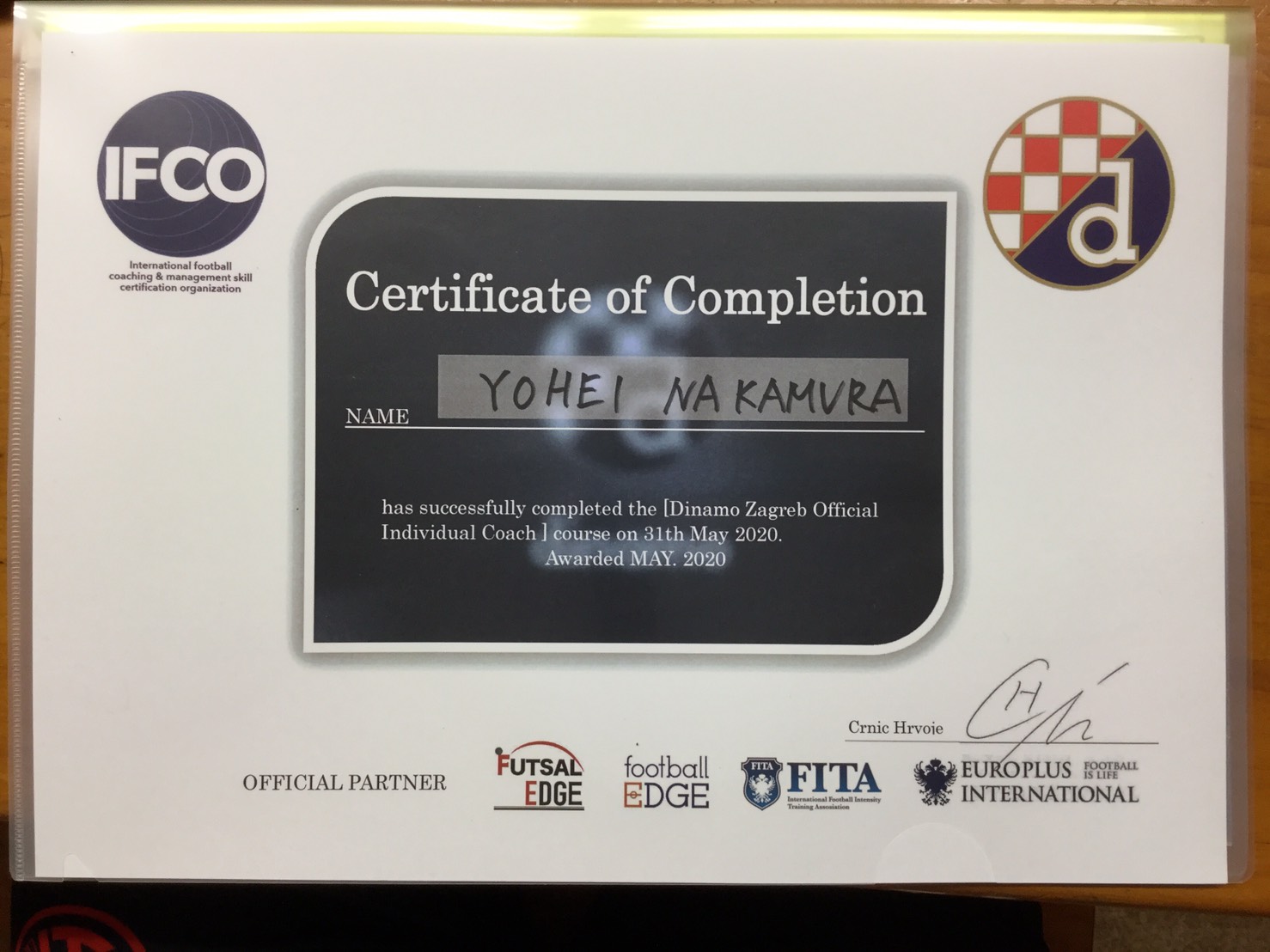 クロアチア ディナモザグレブ公認 インディビジュアルコーチライセンス